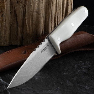 The Condor Bonum Fixed Blade is a compact yet robust knife designed for versatility in outdoor settings. Featuring a 117 mm drop point blade made from 420HC stainless steel with a polished finish, it offers excellent corrosion resistance and edge retention. The flat grind with a secondary bevel ensures efficient slicing and detailed work, making it suitable for tasks ranging from food preparation to bushcraft activities. Designed by Tony Lennartz, the Bonum's ergonomic handle, made from durable white Micarta, provides a secure and comfortable grip, even in challenging conditions. ​