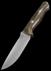 The handle slabs, in this version micarta, are epoxied and bolted to and through the blade. This is a heavy duty Bushcraft/Survival/Military knife that can stand up to abusive use and keep on going.