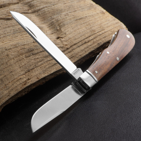 Spey blades feature a straight cutting edge with a curved, upswept tip. The spine remains straight while the edge curves upward to meet it, creating a blade shape optimised for skinning and precision cutting tasks. Traditional spey blades appear in many classic pocket knife patterns.