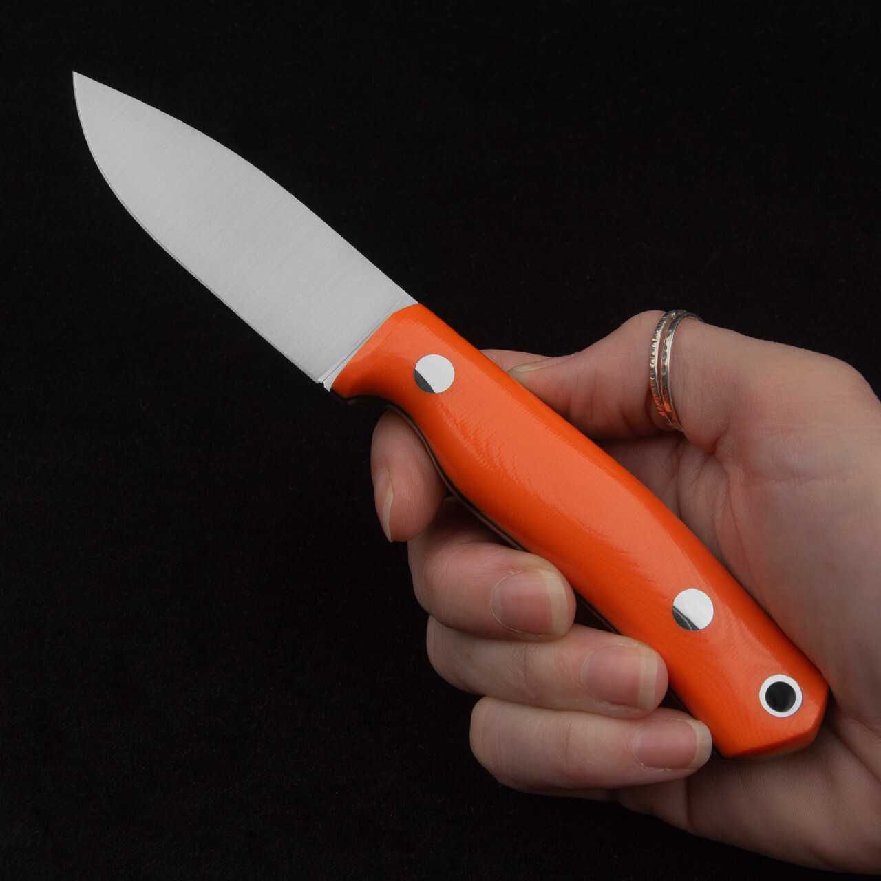 The diamond textured rubber handle grips in wet conditions, cold weather and when you're wearing gloves. The 109mm blade comes in two versions. The orange version uses Sandvik 12C27 stainless steel. The black version uses high carbon steel with a DLC coating to prevent rust.