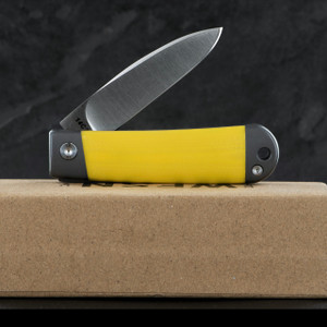 This is a great little knife, blade shape and grind very usable,. The knife is a chunky little thing very tactile, no hots spots and the yellow is a great contrast to the grey scales and bolsters, if you need a bespoke case then Dark Arts Leather will make you one similar to the WESN Micro blade case.but much better in quality.’
